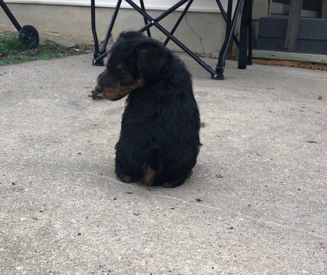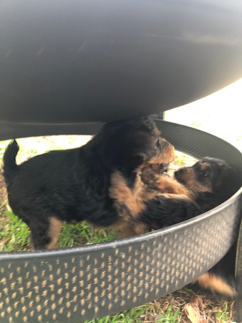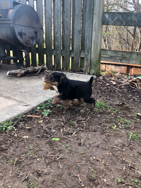 This is the third time the puppies played outside, the weather has been rainy off and on since the beginning of this week. The first time they played outside it was a sunny day, they lightly and cautiously pitter pattered their little paws outside. It’s like they move in slow motion when their learning or being exposed to things for the first time, so adorable. Today HOWEVER….it was nothing but zoomies like nobody’s business, they must have learned that from Cruz while I was away at work ๐ I’ll have to try to record that one day for ya’ll. Here are some pictures of them, they are 2 days shy of being 6 weeks old.